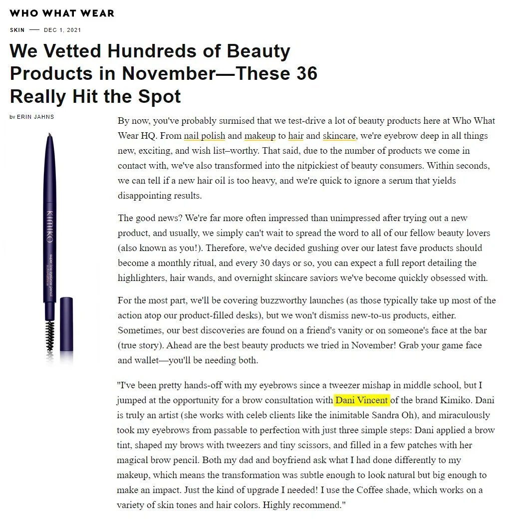 The Chalkboard: "Discover this brow guru’s do’s and don’ts of styling eyebrows: Danielle Vincent, celebrity makeup artist and founder of clean Japanese cosmetic brand, KIMIKO, believes less is more when it comes to beauty. Her ultra-fine eyebrow pencils are one of our absolute favorites for a hyper-realistic brow — the next best thing to natural."